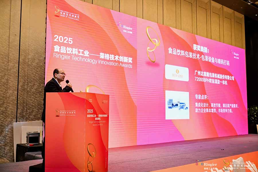 ????8月14日,“2025食品飲料行業(yè)——榮格技術創(chuàng)新獎”頒獎典禮在廣州隆重舉行。達意隆憑借72000BPH吹貼灌旋一體機,在眾多創(chuàng)新成果中脫穎而出,榮獲“技術創(chuàng)新獎”。